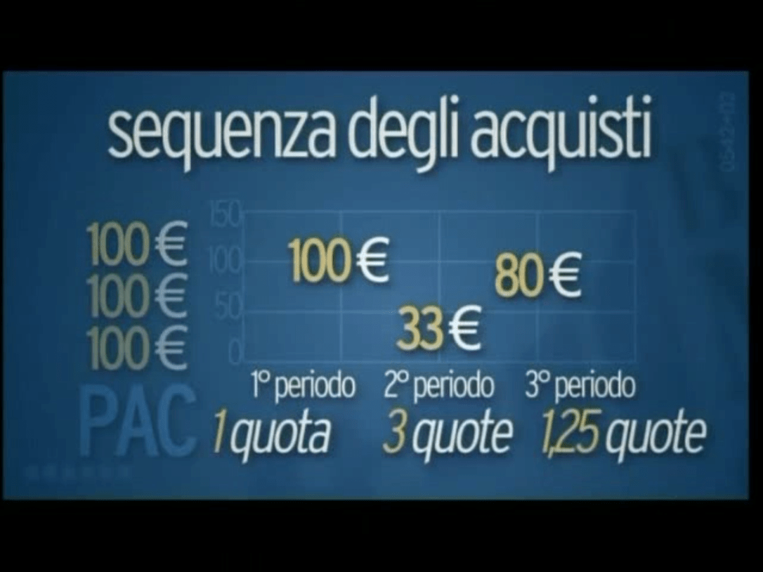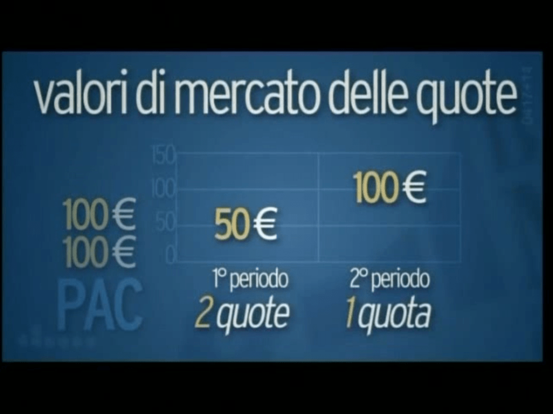 Questo metodo, consiste nell’investire una stessa quota di denaro a intervalli di tempo regolari, per cogliere le opportunità del mercato. Infatti frazionando l’investimento con un importo fisso è possibile sia ottenere un prezzo medio d’acquisto inferiore alla media dei prezzi, ma anche sfruttare al massimo gli eventuali momenti di flessione dei mercati. Come? Attraverso il principio del Dollar Cost Average. Funziona cosi, farò un primo esempio: Supponiamo di investire complessivamente € 200,00 in due periodi differenti in ognuno dei quali investiamo €100,00. Ipotizzo che il valore di mercato di una specifica quota del fondo che vogliamo acquistare, sia inizialmente pari a 50 €, in questo caso con 100,00 € riusciamo ad acquistare due quote del fondo. Nel secondo periodo, i mercati salgono e il valore della quota sale a 100,00 €, con gli ulteriori 100,00 € riusciamo ad acquistare una quota del fondo