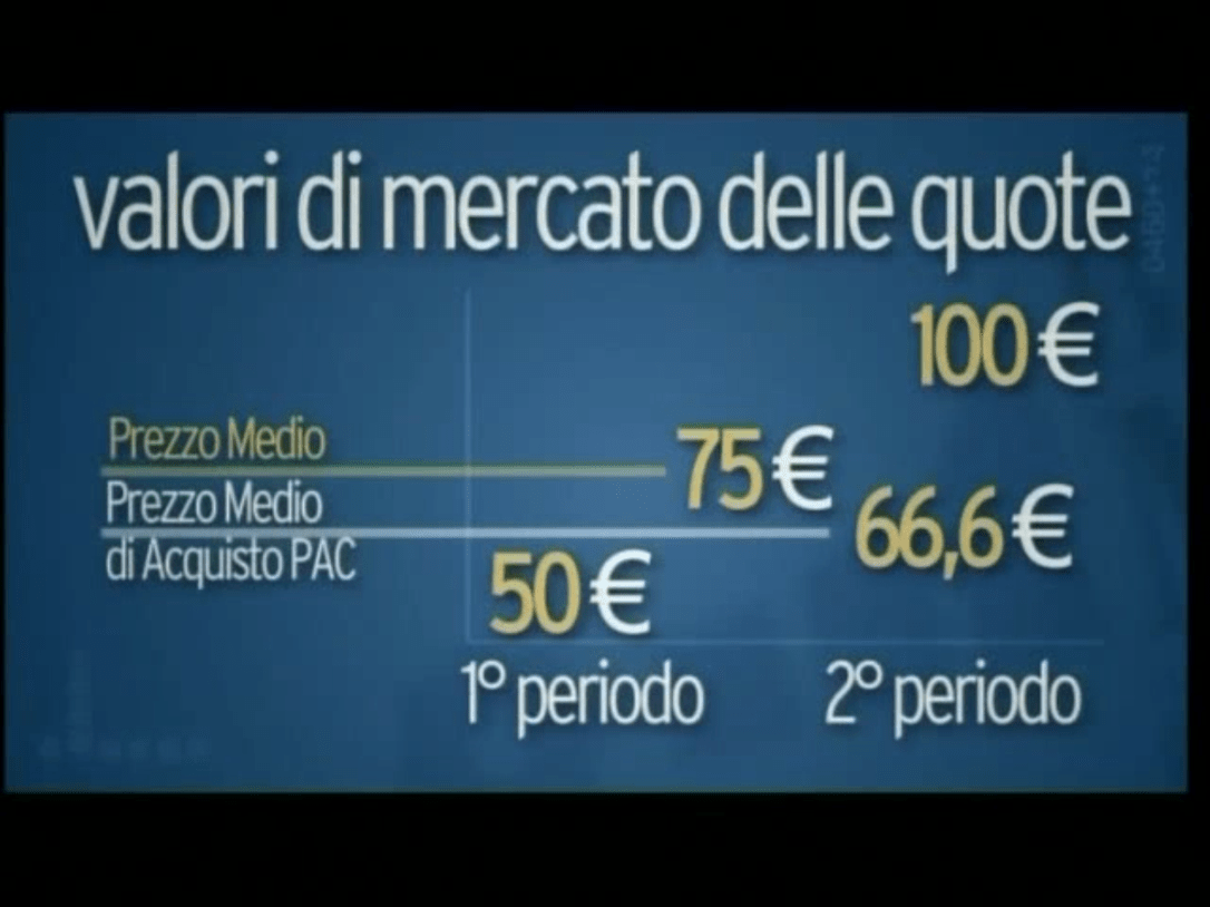 In tutto avremo quindi acquistato tre quote. Istintivamente, verrebbe da dire che, avendo acquistato inizialmente a 50,00 € e successivamente a 100,00 € il prezzo medio di acquisto sia pari a 75,00 €, in realtà il prezzo medio è più basso. Infatti avendo investito 200,00 € acquistando tre quote, il prezzo medio è pari a 66,6 € più vicino quindi al valore minimo del mercato.