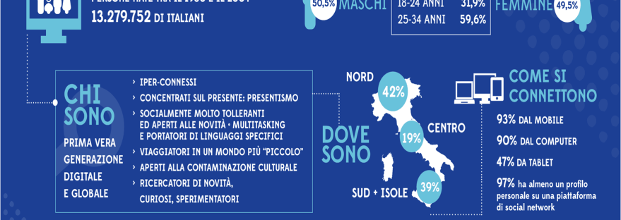 Che si intende quando parliamo di Millennials o di Generazione Y? Si parla di più di 13 milioni di italiani, nati tra il 1980 e il 2004, che risultano costantemente iper-connessi tra loro. Sono abbastanza bilanciati, in quanto questa nuova popolazione è formata dal 50,5% di uomini e dal 49,5% da donne. Questa nuova generazione… Continua a leggere I millennials o Generazione Y